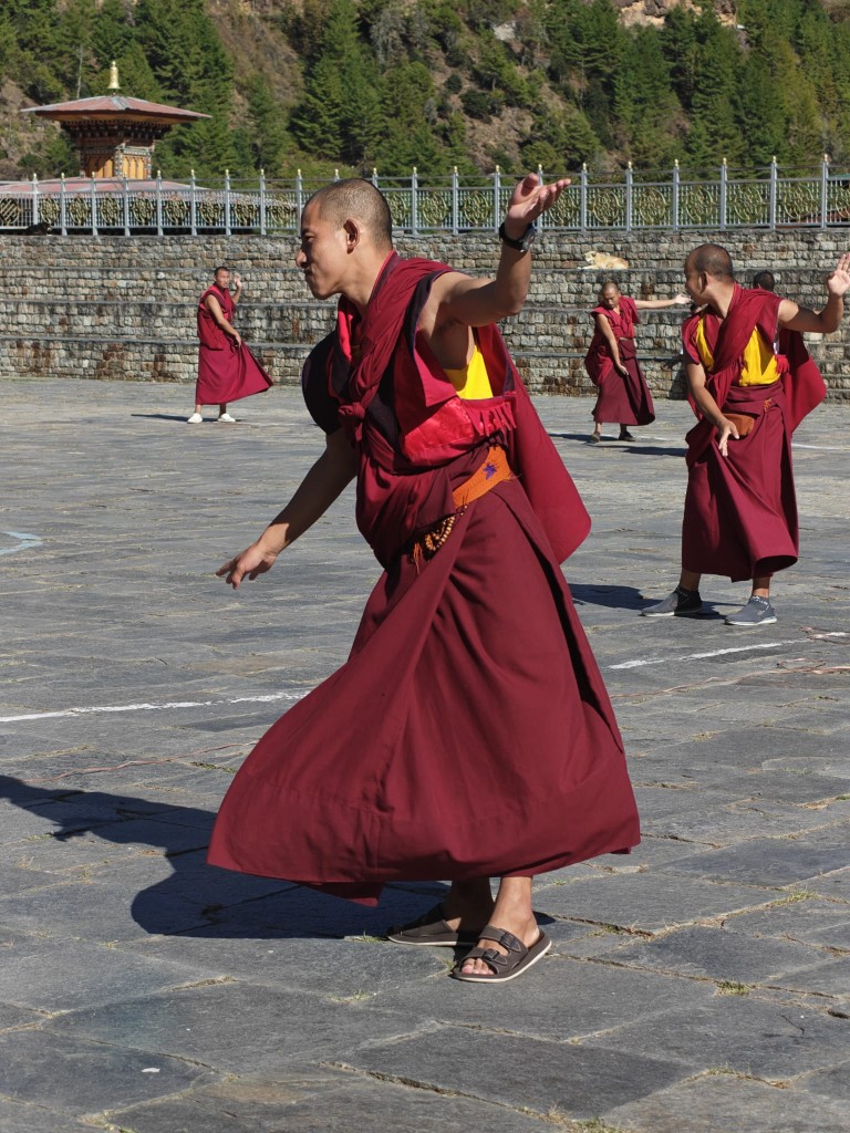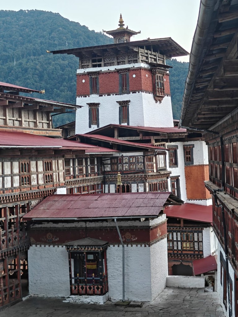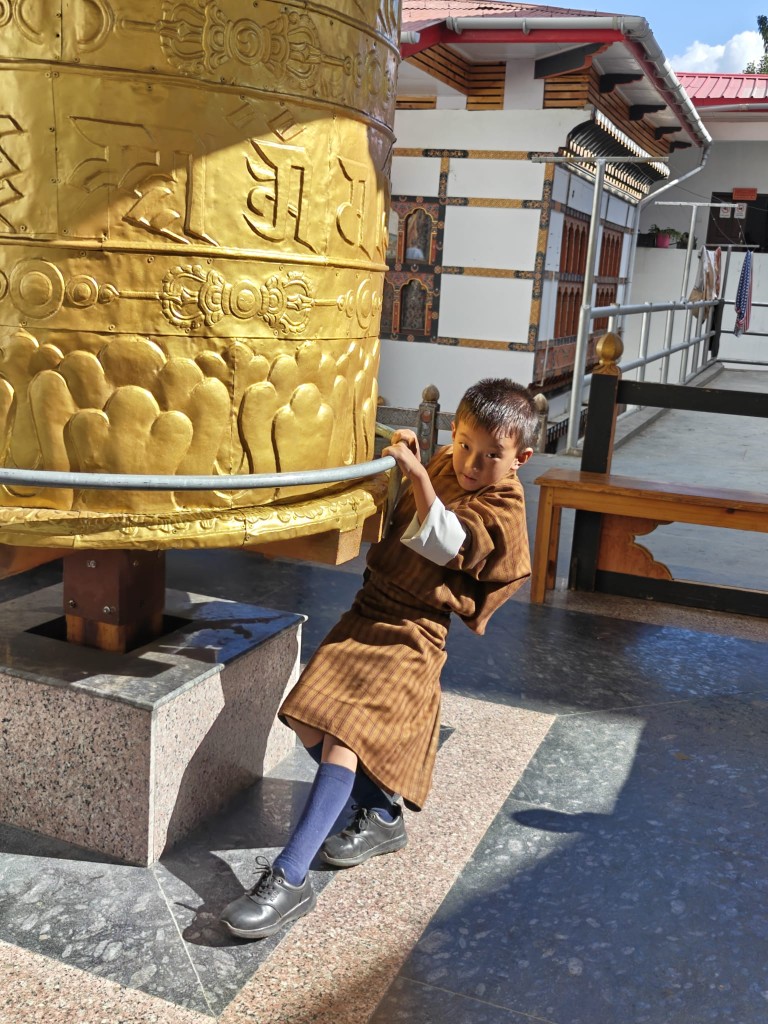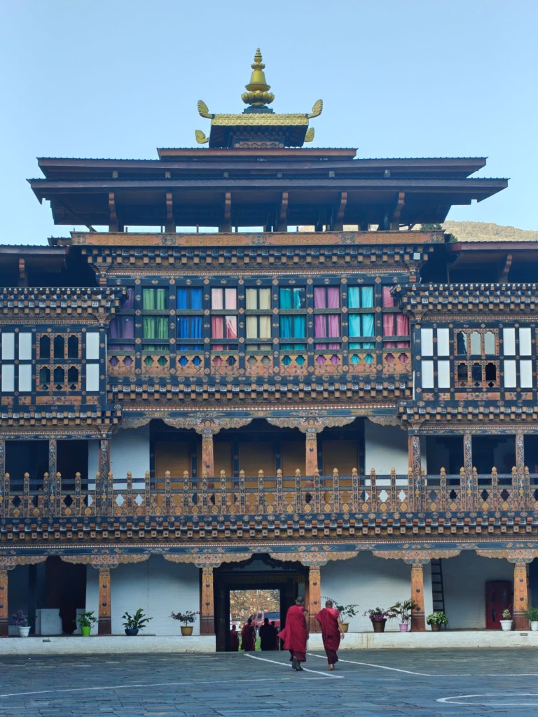Ceste vodijo višje, v dolino Phobjikha. Pokrajina diha kot diha nebo – široko, prozorno. Tu stoji Gangtey Monastery, dom “rdečih klobukov” sekte Nyingmapa. Otroci v rdečih haljah se smejijo, eden igra na boben. V zraku kadilo in masleni čaj. Menihi razlagajo, da vsak zvok v naravi nosi sporočilo. Če ga znaš poslušati, slišiš Budo. Na stenah freske s tisoči obrazov sočutja, v notranjosti kip, ki mirno gleda v večnost. Ko zapuščamo samostan, slišim pesem. Morda je molitev, morda le veter. V Butanu ni razlike. In to je umetnost simbioze – narave in človeka.