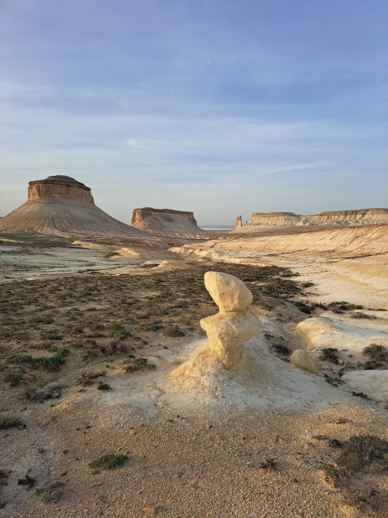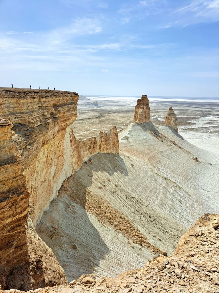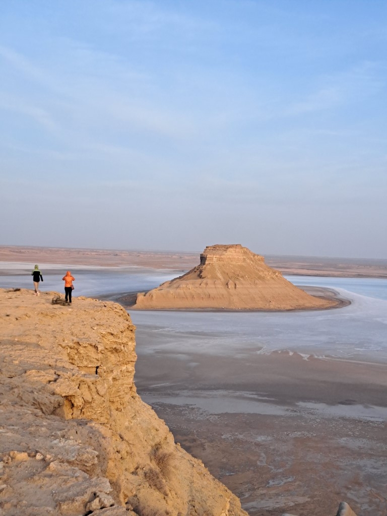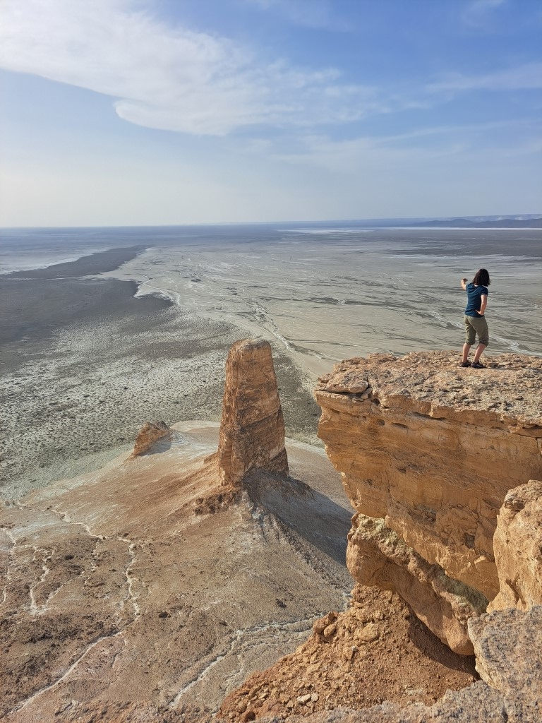 Rob nekdanje obale se nadaljuje več 100 kilometrov. Postavimo kamp. Zavetja ni, a zato je razgled nepozaben. Na dnu stojijo osamelci. Nekdanje gore, bolje rečeno otoki v nekdanjem morju, olupljeni od tisočletnega sonca in vetra, ki počasi, a vztrajno brusi kamenček za kamenčkom. Nekateri so ošiljeni kot čekani, drugi zaobljeni kot orjaške jurte, spet tretji kot sfinge, ki varujejo okoliške »gradove«. Gradove, ki so jih prebivalci že zdavnaj prepustili toku časa.