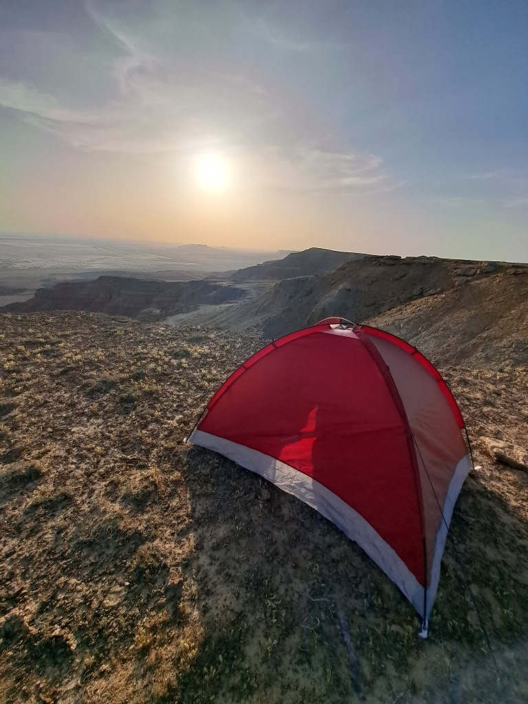 Veter brije čez odprto ravnico. Močan, da šotori plapolajo kot zastave. Založili smo jih s kamni, saj klini v mehkem pesku ne držijo dovolj…